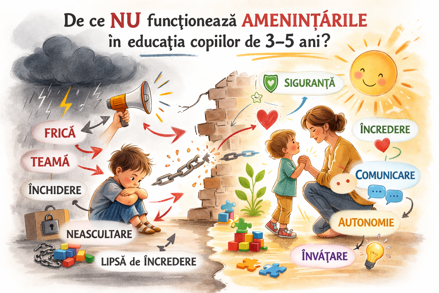 La vârsta de 3–5 ani, copilul se află într-o etapă esențială de dezvoltare emoțională și neurologică. Potrivit teoriei atașamentului formulată de John Bowlby, relația de siguranță dintre copil și adult este baza pe care se construiește învățarea. Când părintele recurge frecvent la amenințări, mesajul transmis nu este "învață să faci asta", ci "comportă-te ca să nu pierzi relația sau privilegiul". Accentul se mută de la învățare la evitare a pedepsei.